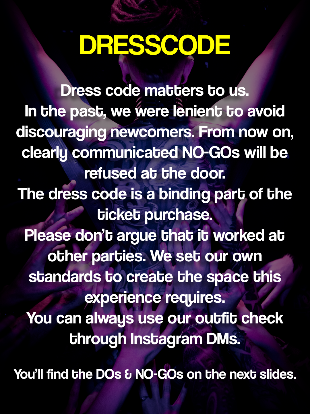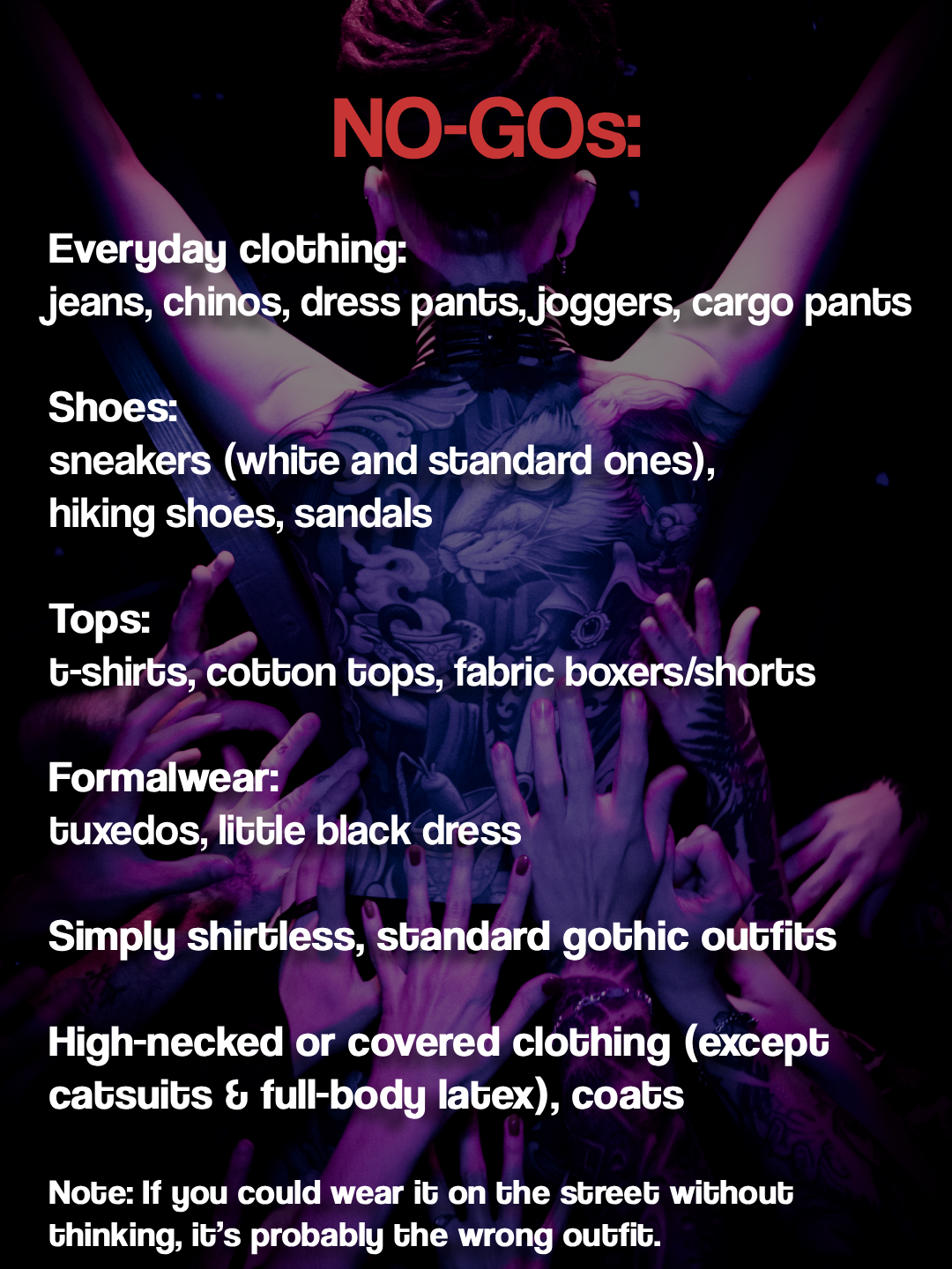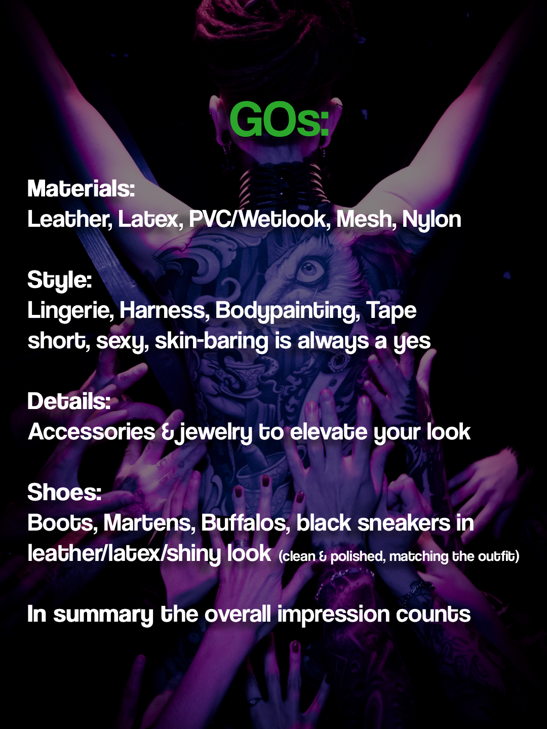 Important: Your outfit counts as a whole – it’s about the full impression, not just one piece! Matching shoes required (but comfortable enough to dance in). Think about: Would you wear this in your everyday life? Then it might not fit the night.